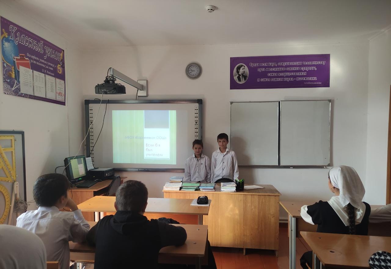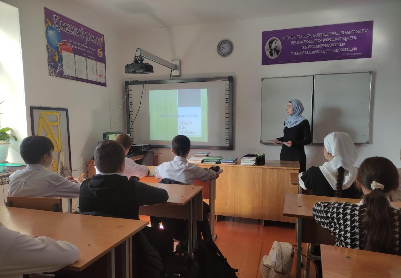 25.09.2023В рамках проведения «Года педагога и наставника» 25.09.2023г. в 5-6 классах прошло мероприятие по теме: «Если б я был учителем» в форме беседы- диалога, в ходе которой учащиеся не только узнали историю возникновения профессии учитель, но и рассказывали, каким должен быть человек, выбравший эту профессию. Рассуждали, что выбирая профессию, учителя нужно обязательно знать все её положительные и отрицательные стороны и пришли к выводу, что профессия учитель - сложная, трудоёмкая, но самая необходимая на земле. В диалогах с учащимися была закреплена мысль, как учитель оказывает большое влияние на жизнь учащихся, на развитие его личности, становление в обществе.